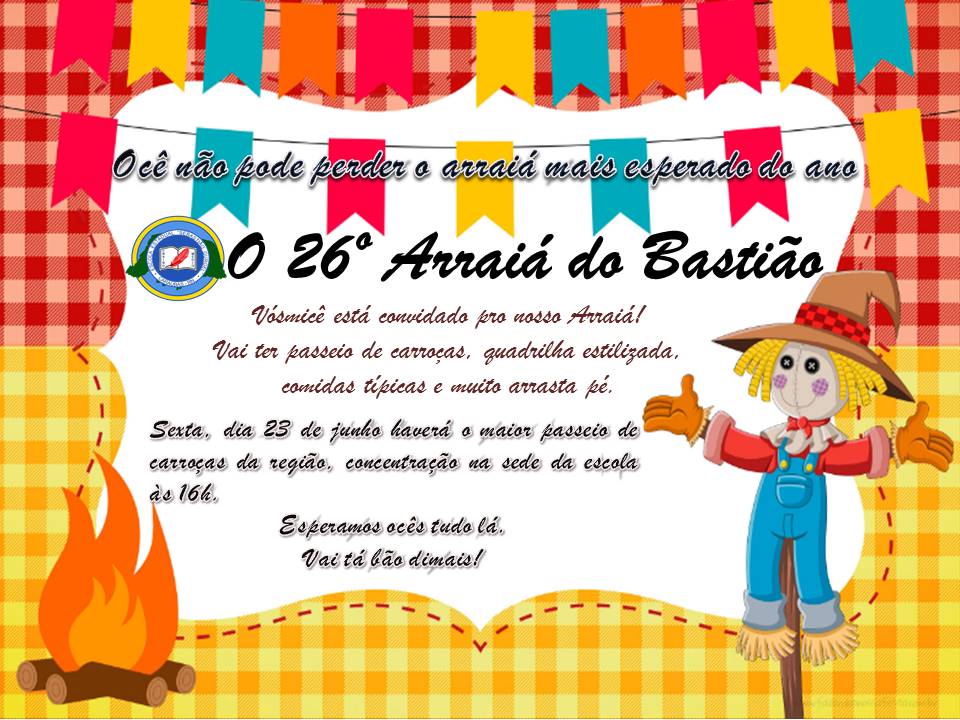CONVITE PARA O "ARRAIÁ DO BASTIÃO" Por: leysson21:00Caraúbas, Eventos, NotíciaComentarios Compartilhar: